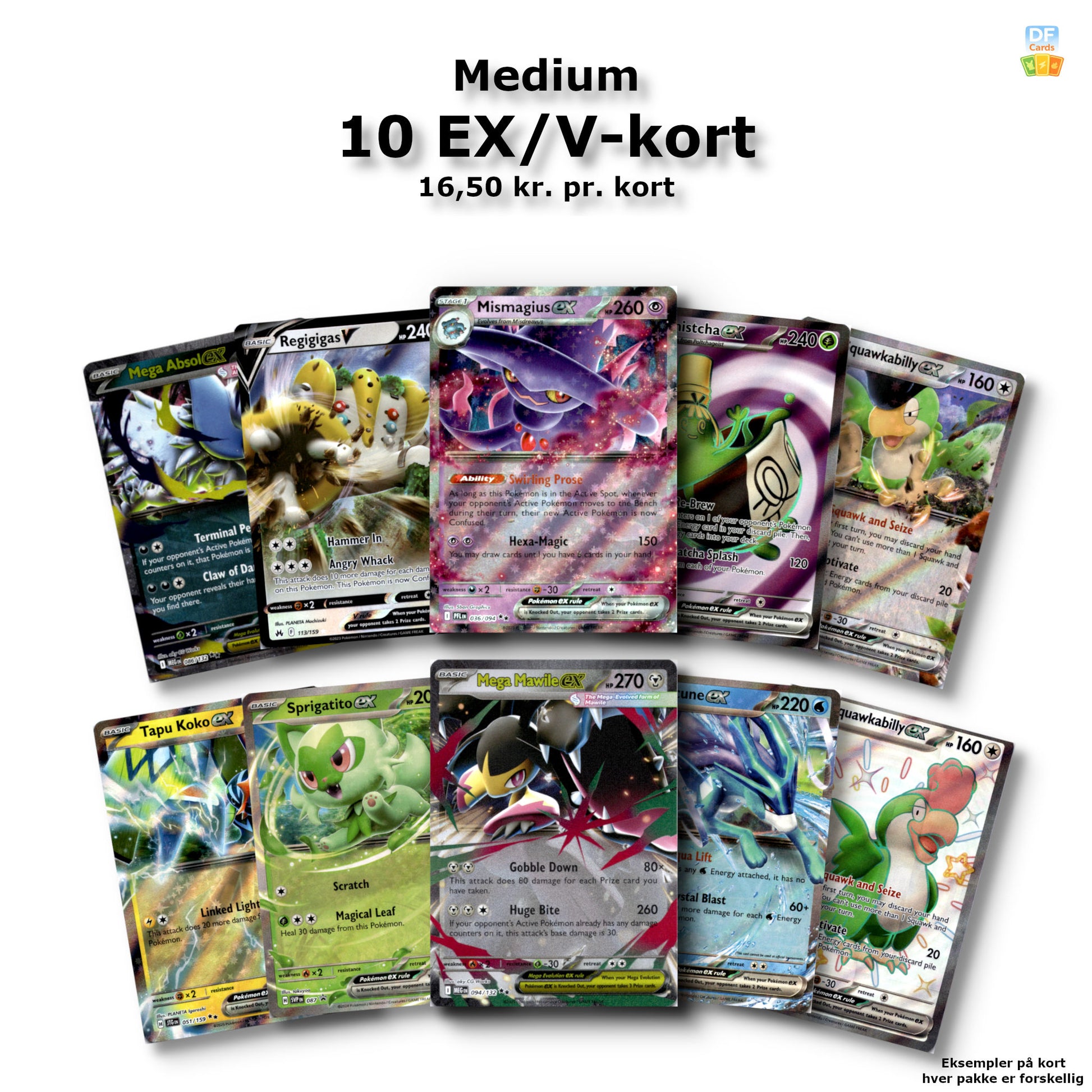 Dette er en custom Pokémon-kortpakke sammensat af DF Cards. Kortene på billederne er eksempler – indholdet varierer. Der kan forekomme dubletter